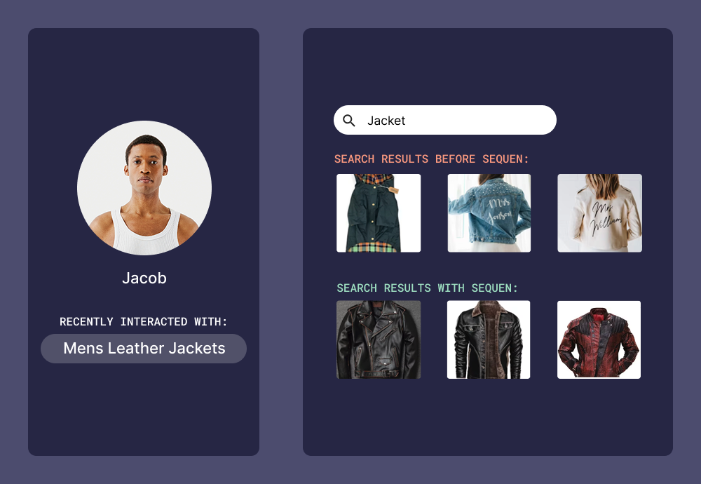 Users guided exactly where you want them to be. Adapting user intent in real-time to drive the desired outcome. Results for query “jacket” for a user that recently interacted with "men's leather jackets"