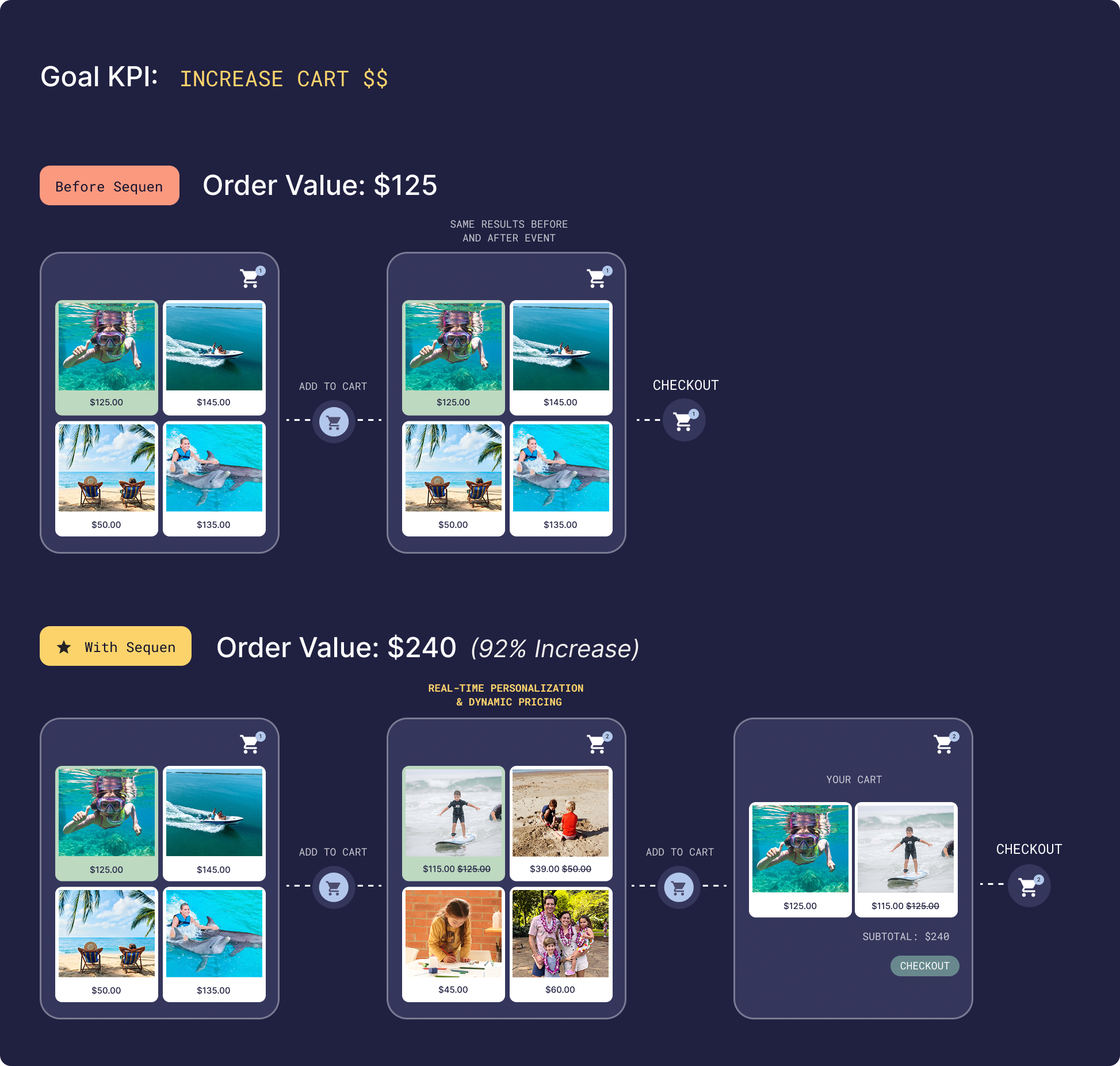 Sequen’s in-session-native approach is critical to behavior design, constantly calculating the next behavior most likely to drive your desired outcome based on user interactions. Every user. Every moment of every session. Each scroll, hover, dwell, click is calculated and updates the ideal sequence of events for that user to take your designed action.